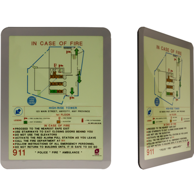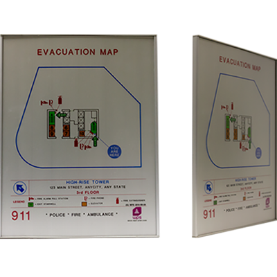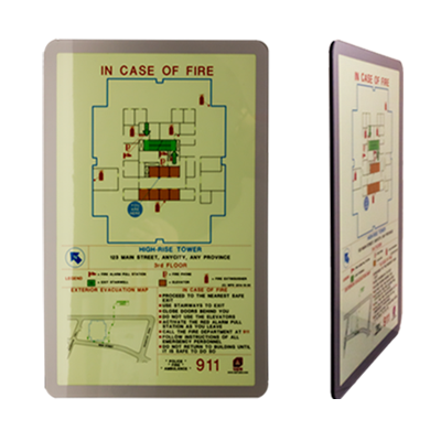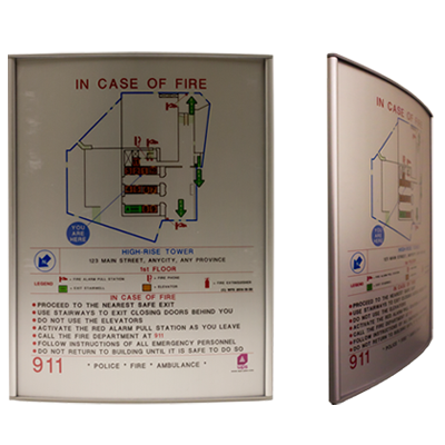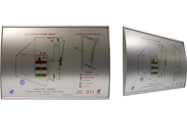 Below are pictures of the Evacuations sign frames we offer. Brushed Metal and Acrylic, both are available with a photoluminescent or brushed metal insert. Standard backing (CAD artwork included).